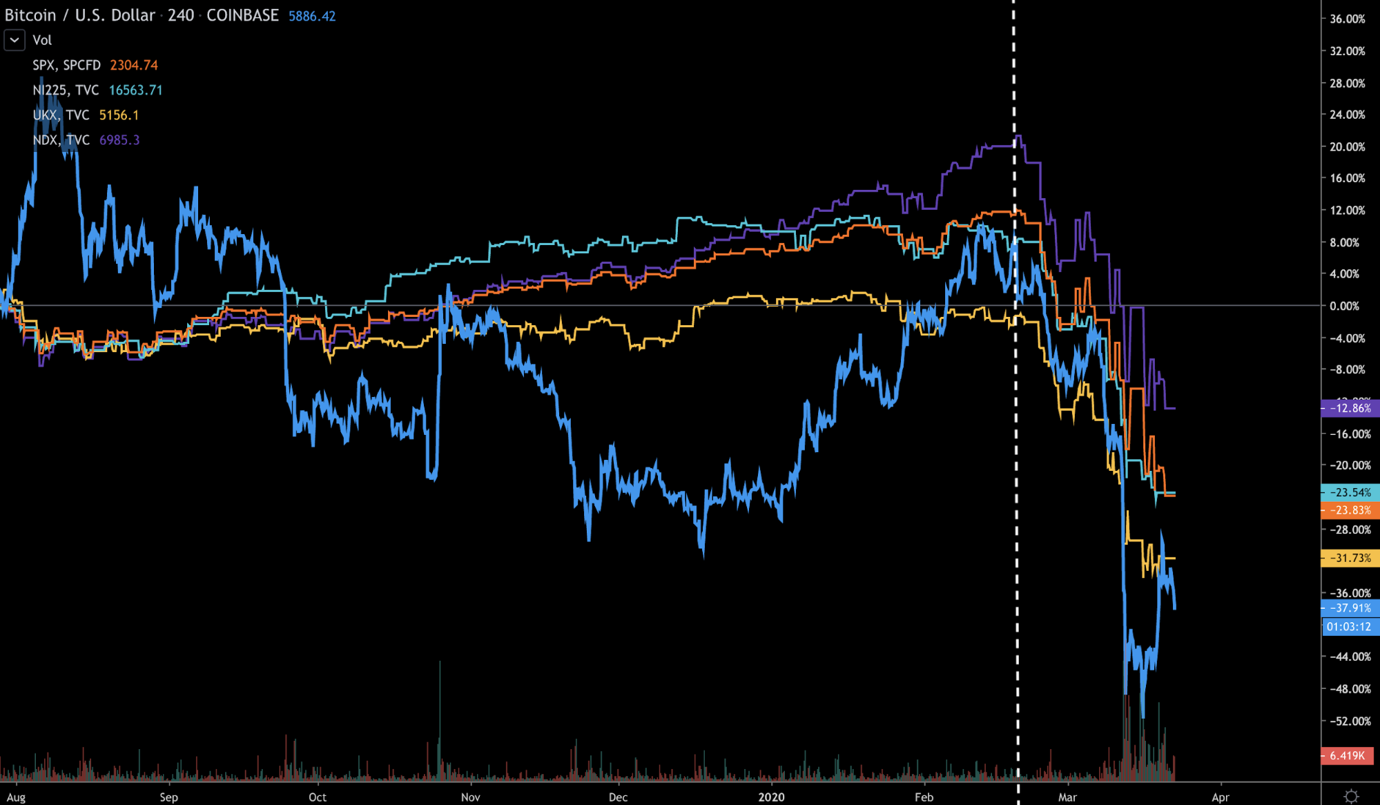 Uncertainty is the biggest threat that drives all markets down. If you take a look at the correlation chart below you can spot that by the end of February - beginning of March 2020, the interrelation between BTC and S&P 500, Nasdaq 100, Nikki 125, FTSE 100 was asymmetric. Currently, the correlation between almost all assets is around 1, which implies that all markets are moving in tandem for now.