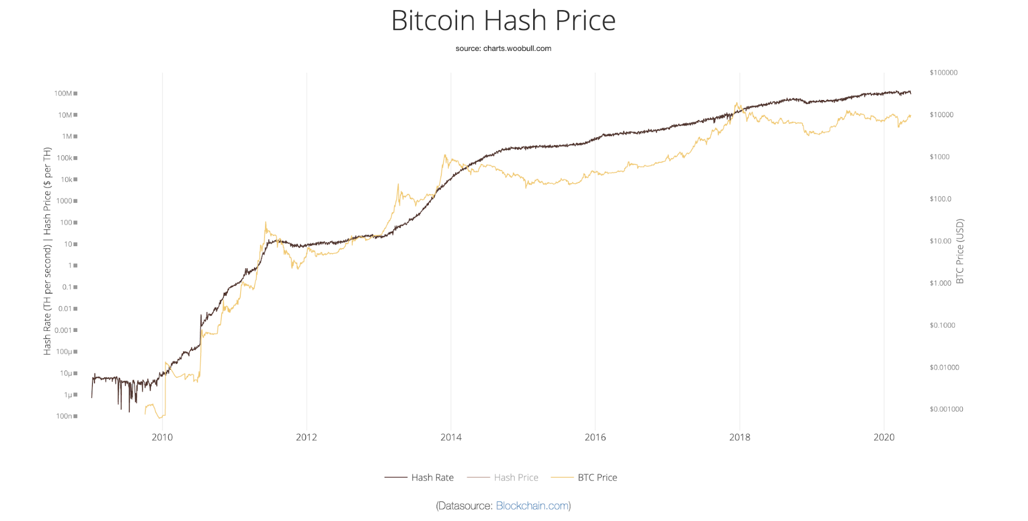 Spot the correlation between the price growth and hash rate. The higher hash rate indicates the overall strength of the network. As new mining devices with improved computation power are emerging on the market, the cost of mining decreases.